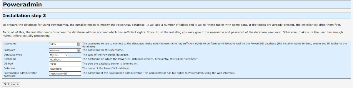 - Use the same username and password that you created while while configuring the PowerDNS database. Choose a password for the Poweradmin web interface and click go to step 4.