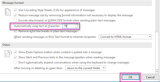 - Scroll down to Message format. In Automatically wrap text at character, enter a number to indicate where you want Outlook to wrap text. Keep this between 65 and 70 characters.